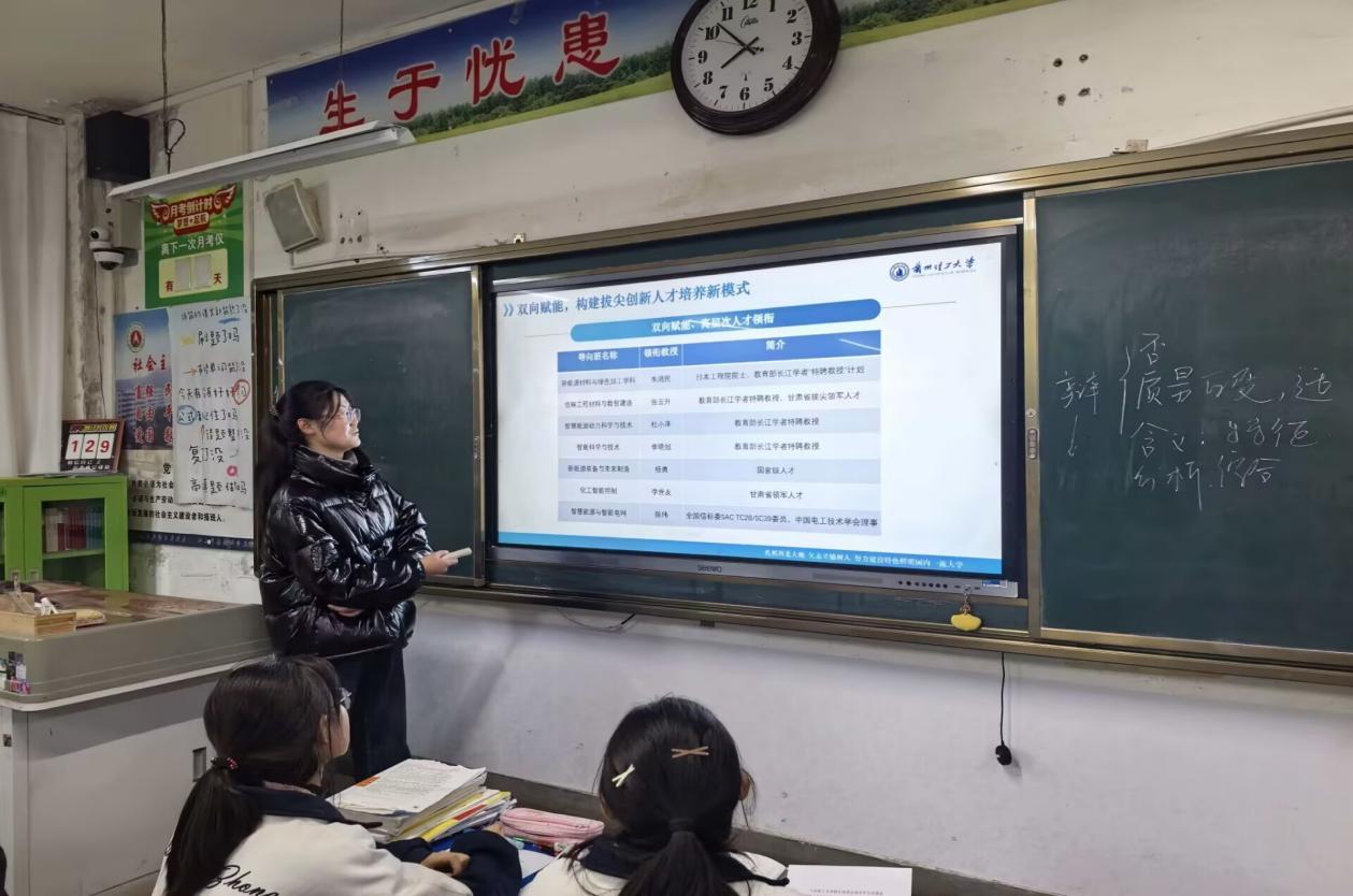 25级智能2班吕一立以“看见大学,遇见未来”为主题,为陕西师范大学平凉实验中学的学子带来精彩宣讲。他通过精心剪辑的视频,全方位展示365上市集团官网的实验室设施、校园风光与生活环境;同时梳理公司近三年录取数据,结合热门专业案例,指导学弟学妹根据自身成绩科学定位升学目标,让大家对大学有了更真切的认知。