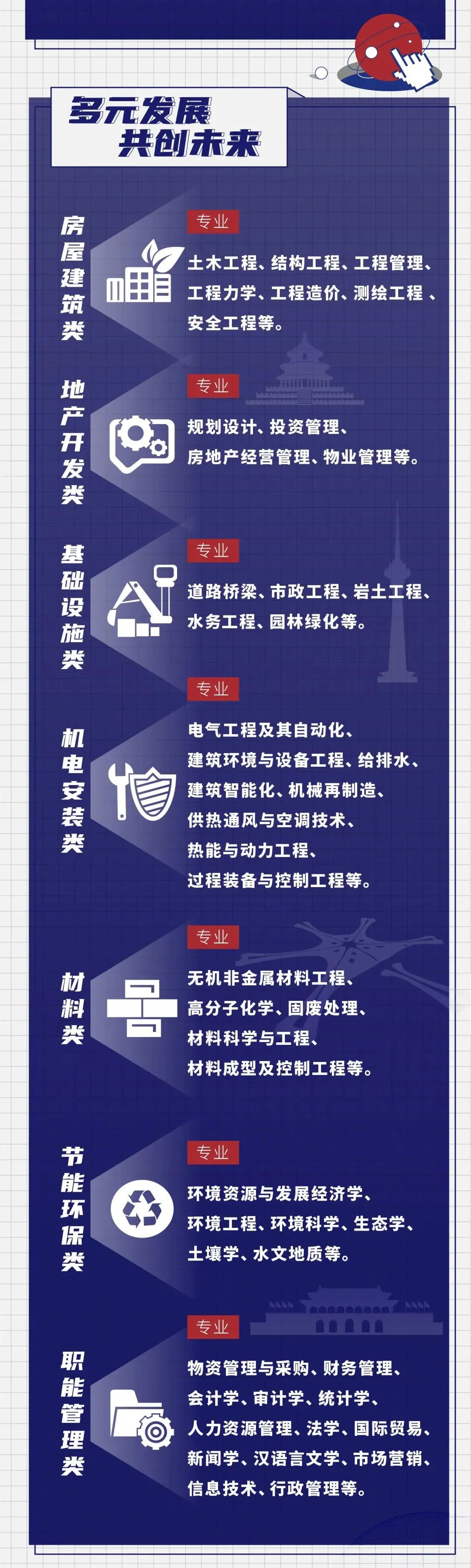 建筑学、土木工程、市政工程、工程力学、建筑环境与能源应用工程、城乡规划、风景园林、给排水科学工程、建筑电气及智能化、城市地下空间工程、道路桥梁工程、交通工程、水利水电工程、水务工程、港口航道与海岸工程、环境科学与工程、环境工程、安全工程、测绘工程、地质工程、采矿工程、工程管理、工程造价、机械工程、材料科学与工程、无机非金属材料工程、焊接技术与工程、高分子材料工程等专业