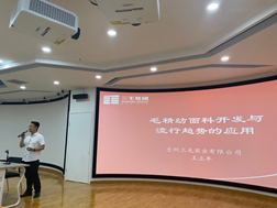 李文全总工程师以“兰州三毛的故事”为主题,向全体实习同学介绍了兰州三毛的发展概况、管理制度、生产经营情况及相关厂规厂纪。总经理助理王立年以“毛精纺面料开发与流行趋势的应用”为主题,对实习同学进行了系统的面料设计培训。纺纱厂厂长宋翠红以“毛精仿纱线生产加工流程”为主题,重点讲解了毛精纺纱线的生产流程。织布厂副厂长汪燕霞结合车间目前生产具体情况,以“织造工艺流程”为主题,详细讲解了毛精纺面料的诞生,同时讲解了三毛织造车间目前主要织机的生产特点。