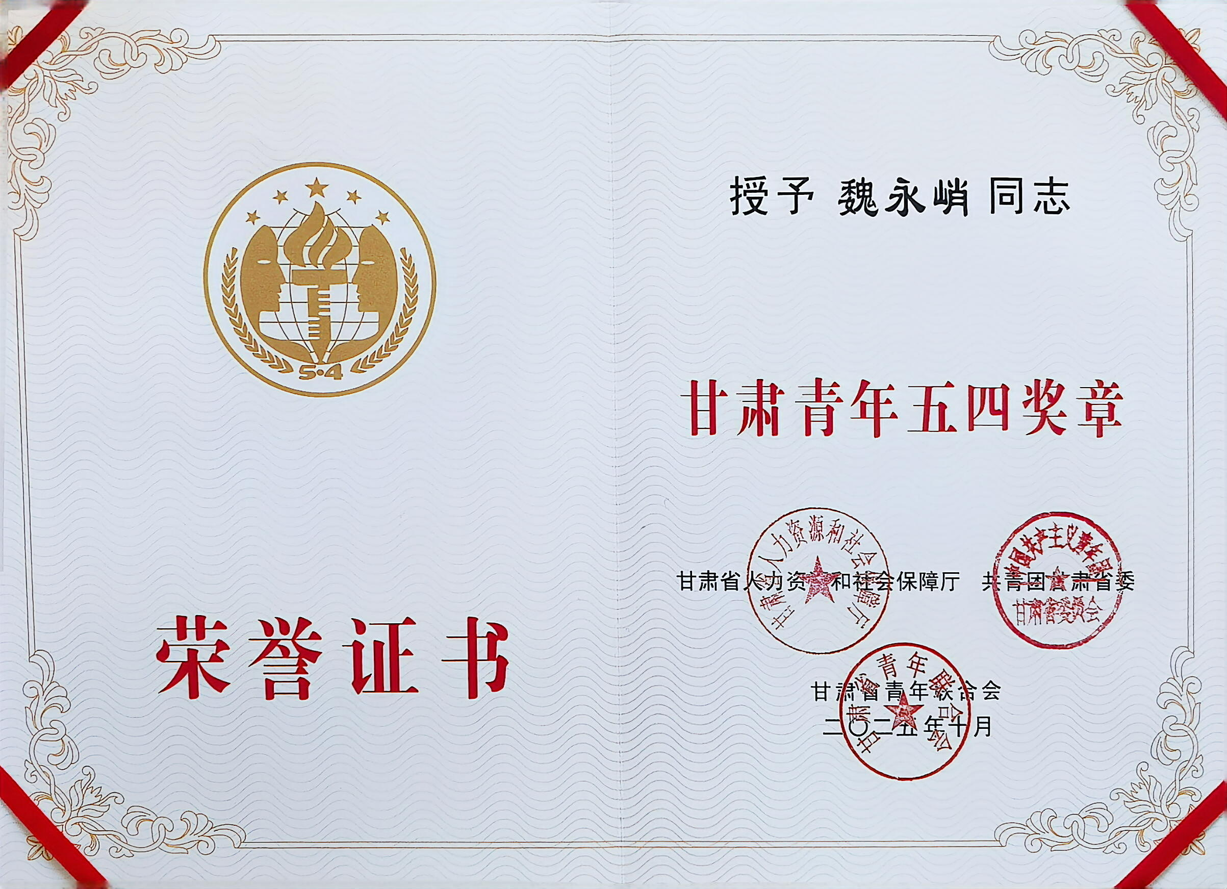 近日,甘肃省人力资源和社会保障厅、甘肃省教育厅、共青团甘肃省委、甘肃省青年联合会、甘肃省少工委联合公布了《关于表彰甘肃青年五四奖章暨甘肃省五四红旗团委(团支部)、优秀共青团员、优秀共青团干部和优秀少先队辅导员、优秀少先队集体的决定》,公司青年教师魏永峭荣获“甘肃青年五四奖章”。
