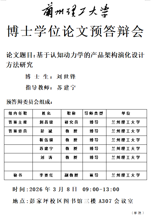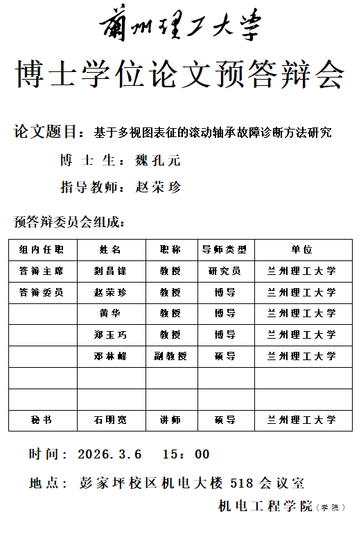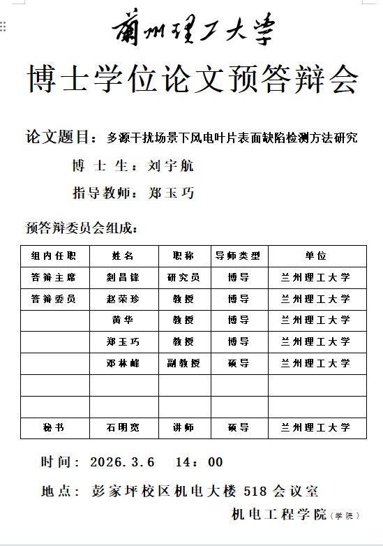 2026年春季学期博士研究生学位论文预答辩会(党旭 廖治祥 刘世锋 刘宇航 魏孔元 周有欣)