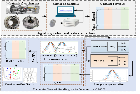 随着人工智能、传感器与数据分析技术的协同发展,机械设备的大规模健康监测与故障诊断已成为可能。然而,装备监测数据往往呈现出工业大数据的典型特征,即数据量庞大、特征维度高、高价值故障样本稀疏。针对故障诊断过程中数据普遍存在的维数灾难长尾分布难题,本研究提出了一种名为云增强与云选择Cloud Augmentation and Cloud SelectionCACS)的模块化智能诊断框架。该框架利用基于特征云的变换技术,实现了故障样本的增强与特征维数的系统化约简。该方法在齿轮和轴承的高维、长尾故障数据集上进行了验证,实验结果表明其具有较好的诊断性能。该研究为复杂工业背景下机械装备的智能故障诊断提供了新思路。该研究工作得到了国家自然科学基金等项目的资助。